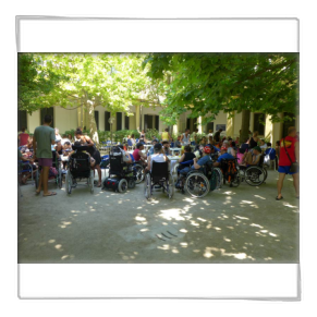 Ospiti disabili e loro familiari in giardino a Villa Marina